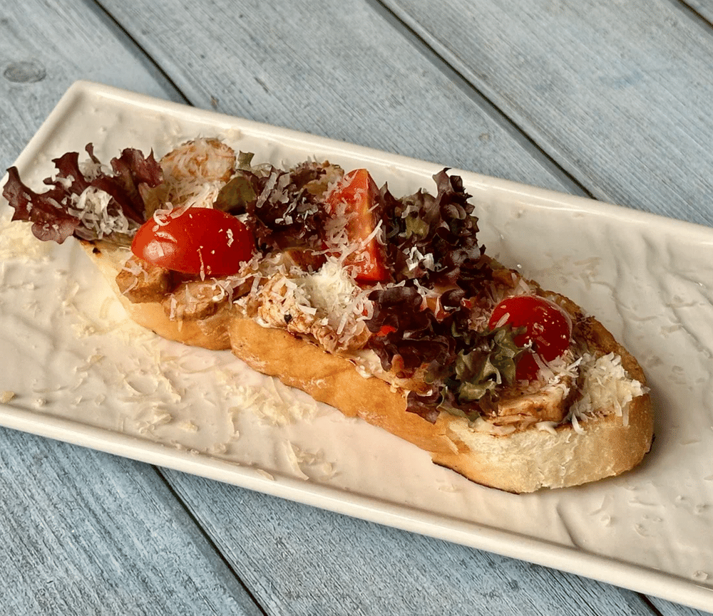 Цыплёнок, пармезан, лист салата, соус цезарь, чиабатта, томаты черри