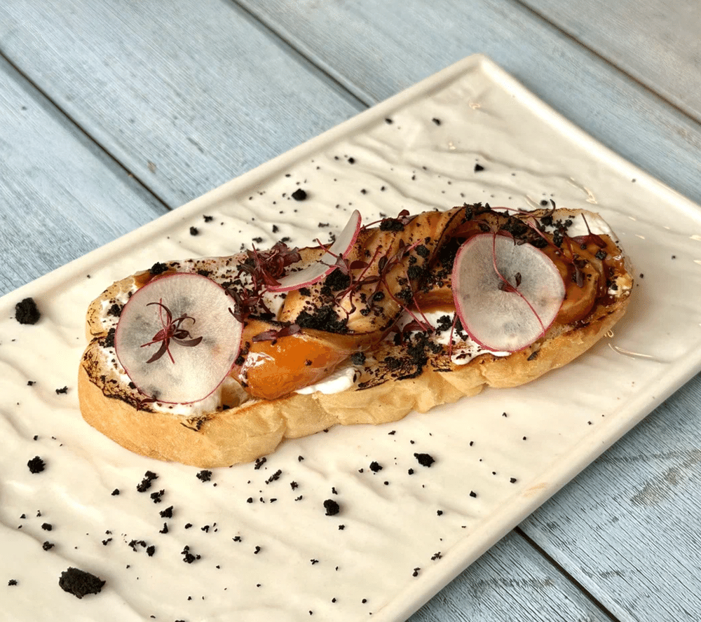 Опалённый лосось, сливочный крем, слайс редиса, чиабатта