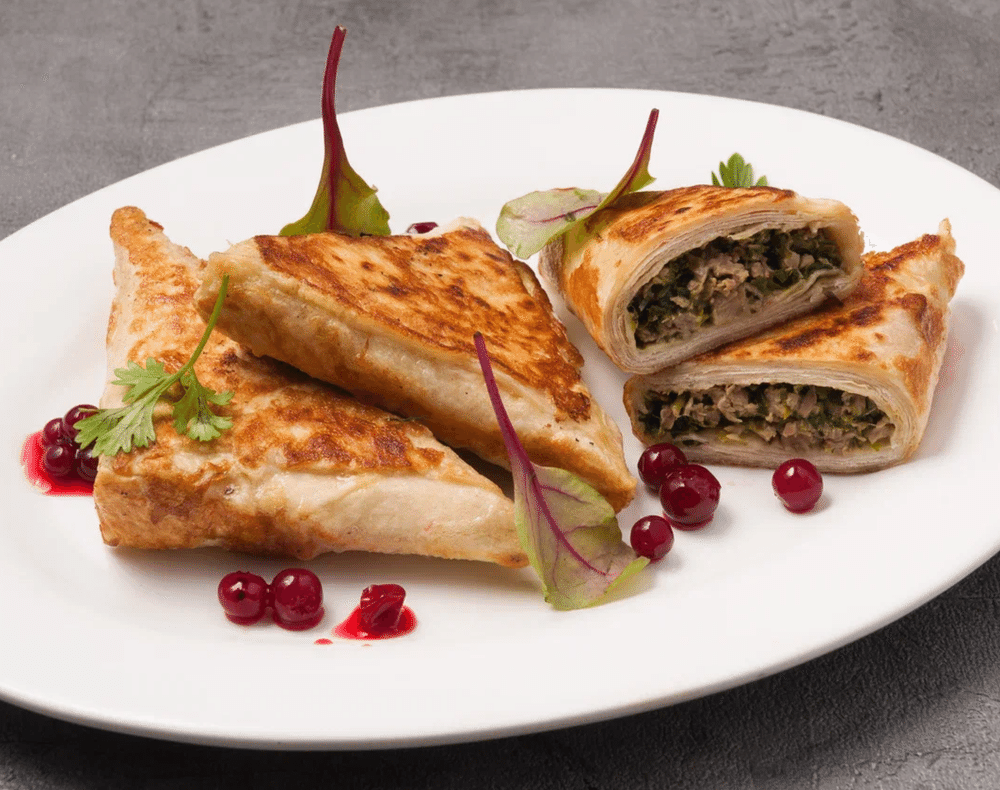 Лаваш, томлёная баранина, шпинат, листья салата, соус томатный