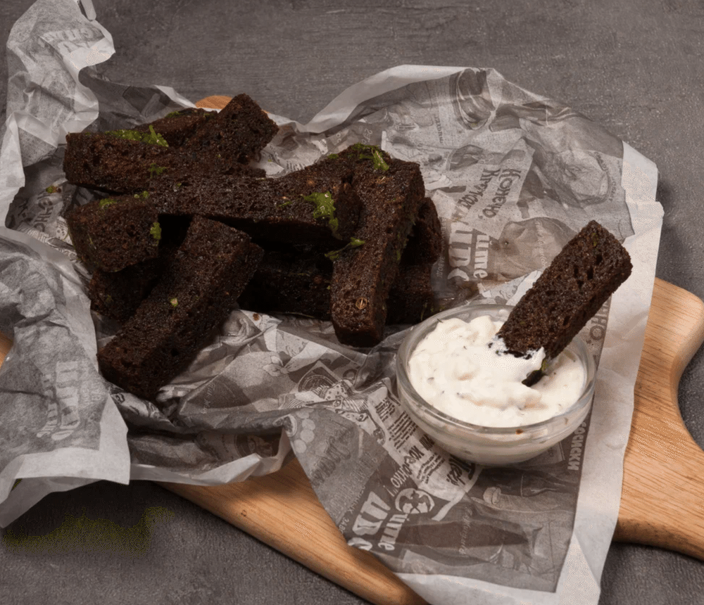 Бородинский хлеб, чесночное масло, соус чесночный
