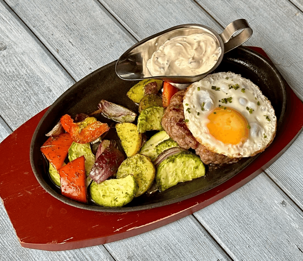 Фарш свиной, фарш говяжий, картофель, лук красный, цукини, болгарский перец, чесночное масло, яйцо, соус чесночный