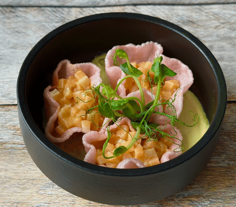 Лосось, апельсин, лук зелёный, заправка из огурца, сок лимона